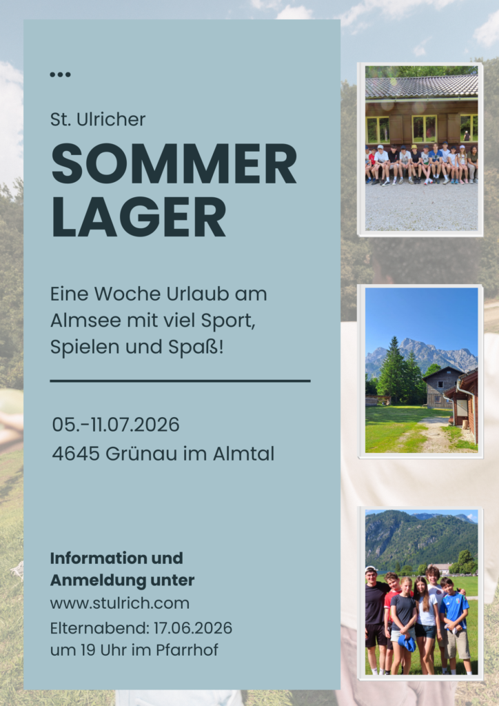 NewsletterNewsletterarchivAnmeldung zum NewsletterSt. Ulrich aktuellPfarrkalenderKirchenrenovierungWir freuen uns über alle Kinder, die mit uns immer sonntags um 9:30 Uhr Kinderwortgottesdienst feiern wollen!Ostern in St. Ulrich:02.04. um 19 Uhr: Gründonnerstagsliturgie inklusive Fußwaschung03.04.: 14:30 Uhr Großer Kreuzweg & um 19 Uhr: Karfreitagsliturgie04.04. um 21 Uhr: Osternacht und anschließend Agape05.04. um 9:30 Uhr: Hochamt "Missa Sancti Nicolai Tolentini" von Johann Michael HaydnSAVE THE DATE!Wir fahren auch dieses Jahr wieder auf Sommerlager nach Grünau im Almtal und zwar vom 05.07.-11.07.2026Hier geht's zur Anmeldung: Anmeldeformular Sommerlager 2026.Alle Fotos vom 72. St. Ulricher Benefizball finden Sie unter diesem Link Youtubekanal der Pfarre St. Ulrich Ein virtueller Rundgang durch die Kirche St. Ulrich
