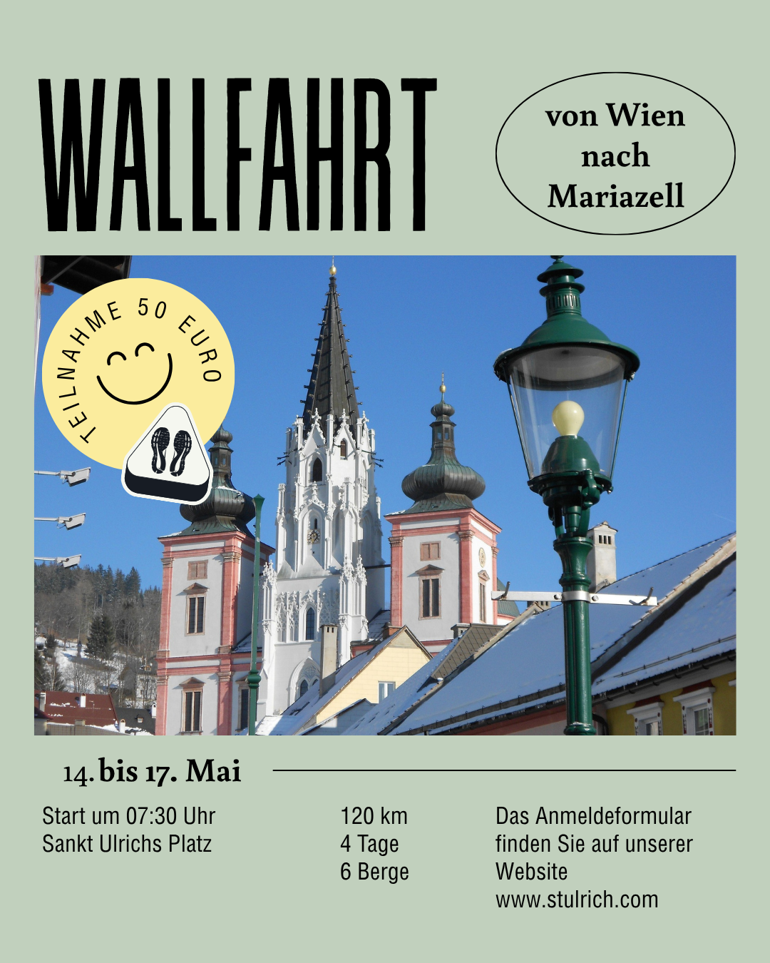 NewsletterNewsletterarchivAnmeldung zum NewsletterSt. Ulrich aktuellPfarrkalenderKirchenrenovierungWir freuen uns über alle Kinder, die mit uns immer sonntags um 9:30 Uhr Kinderwortgottesdienst feiern wollen!SAVE THE DATE!Auch dieses Jahr gibt es wieder eine Wallfahrt nach Mariazell 14.-17.05.2026 - alle Informationen finden Sie hier: Anmeldung Fußwallfahrt 2026Wir fahren auch dieses Jahr wieder auf Sommerlager nach Grünau im Almtal und zwar vom 05.07.-11.07.2026Hier geht's zur Anmeldung: Anmeldeformular Sommerlager 2026.Alle Fotos vom 72. St. Ulricher Benefizball finden Sie unter diesem Link Youtubekanal der Pfarre St. Ulrich Ein virtueller Rundgang durch die Kirche St. Ulrich